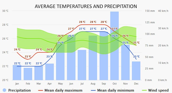 The climate diagrams are based on 30 years of hourly weather model simulations. They give good indications of typical climate patterns and expected conditions (temperature, precipitation, sunshine, and wind). The “mean daily maximum” (solid red line) shows the maximum temperature of an average day for every month for Exumas. Likewise, the “mean daily minimum” (solid blue line) shows the average minimum temperature.