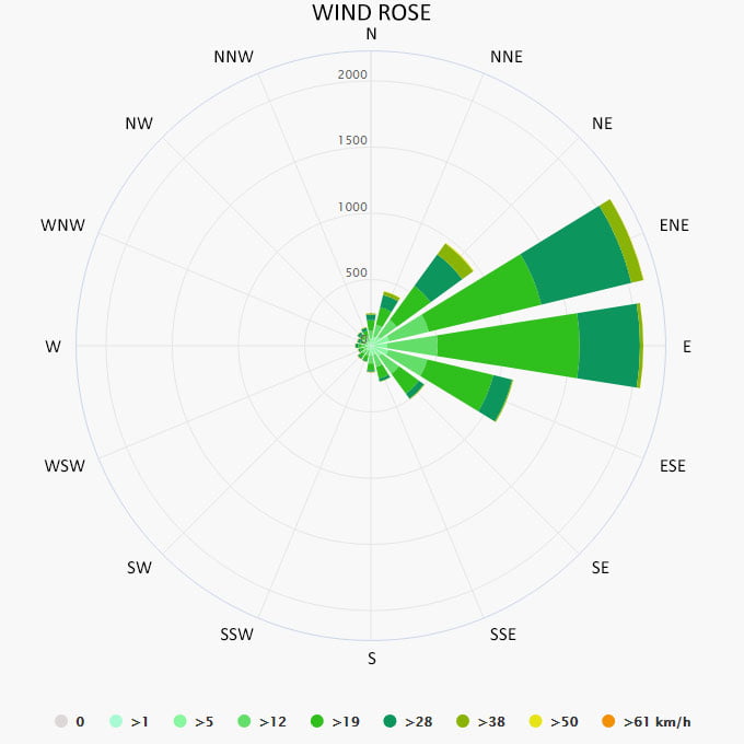 The wind rose for Exumas shows how many hours per year the wind blows from the indicated direction. The diagram for Exumas shows the days per month, during which the wind reaches a certain speed.