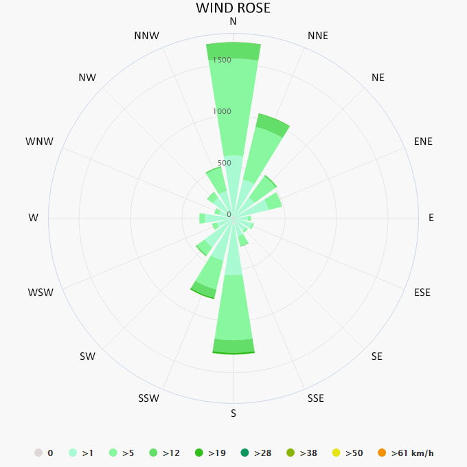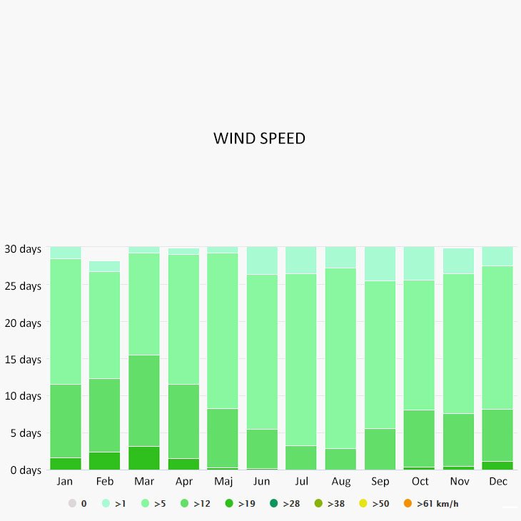 The wind rose for Mexico shows how many hours per year the wind blows from the indicated direction. The diagram for Mexico shows the days per month, during which the wind reaches a certain speed.