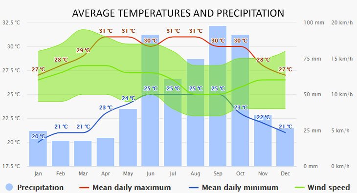 The average annual temperature of areas below 1000 m is between 24 and 28 °C. In the north, the low-lying areas have a lower average temperature from 20 to 24 °C. Big cities lying in the Valley of Mexico have an average annual temperature of 16 to 18 °C. It becomes moderately rainy in the mountain ranges and the southern plateaus, while it’s very rainy in some tropical southern areas. Summer is the rainiest season almost everywhere. On the coast, the climate is generally balmy year-round, but some months are rainy and others dry. Moving towards the south, the sea becomes progressively warmer. Generally, the sea is always warm.