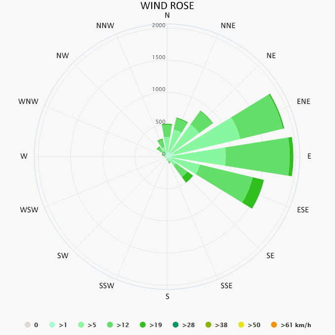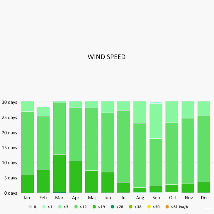 The wind rose for Mexico shows how many hours per year the wind blows from the indicated direction. The diagram for Mexico shows the days per month, during which the wind reaches a certain speed.