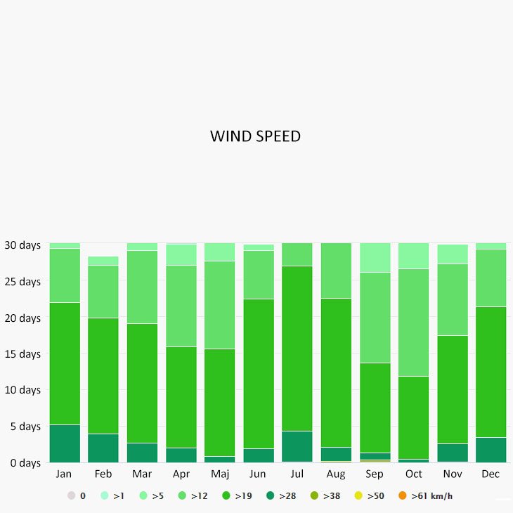 The wind rose for Puerto Rico shows how many hours per year the wind blows from the indicated direction. The diagram for Puerto Rico shows the days per month, during which the wind reaches a certain speed.