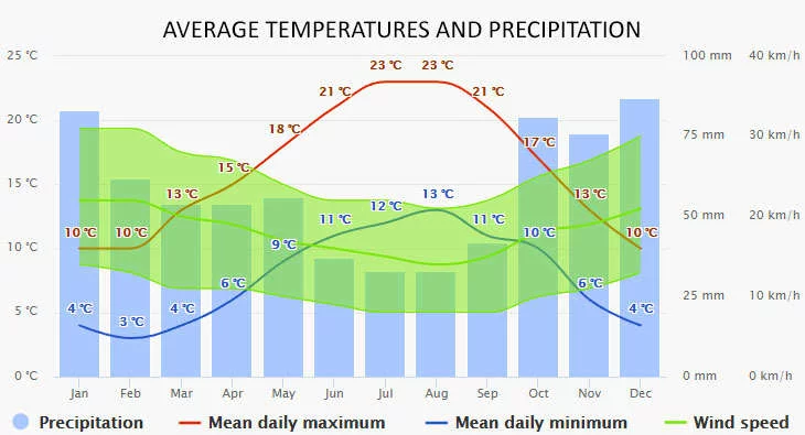 The continental area, which can be heated in summer by the Azores High. This brings subtropical air masses, therefore sometimes it can be hot in summer, with temperatures about 32/33 °C or above. While in winter the city is exposed to cold winds from Eastern Europe, so there may be some freezing or snowy days, with night temperatures about -6 °C.