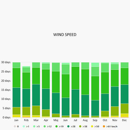 The wind rose for Madeira shows how many hours per year the wind blows from the indicated direction. The diagram for Madeira shows the days per month, during which the wind reaches a certain speed.
