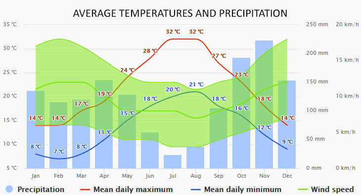 The climate diagrams are based on 30 years of hourly weather model simulations. They give good indications of typical climate patterns and expected conditions (temperature, precipitation, sunshine, and wind). The “mean daily maximum” (solid red line) shows the maximum temperature of an average day for every month for Calvi. Likewise, the “mean daily minimum” (solid blue line) shows the average minimum temperature.