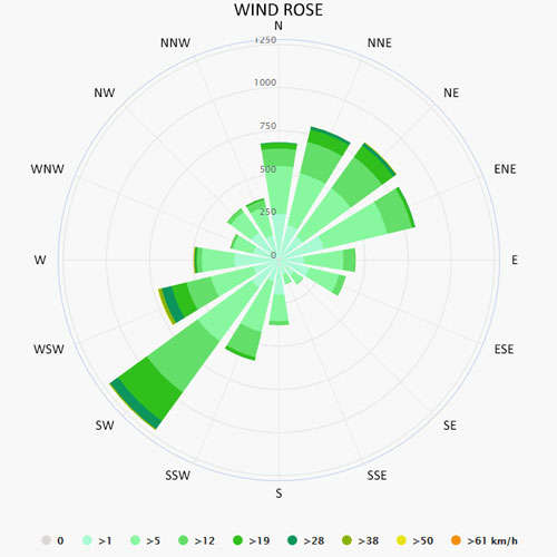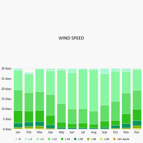 The wind rose for Calvi shows how many hours per year the wind blows from the indicated direction. The diagram for Calvi shows the days per month, during which the wind reaches a certain speed.