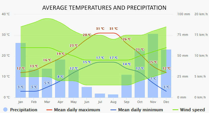 The climate diagrams are based on 30 years of hourly weather model simulations. They give good indications of typical climate patterns and expected conditions (temperature, precipitation, sunshine, and wind). The “mean daily maximum” (solid red line) shows the maximum temperature of an average day for every month for Nice. Likewise, the “mean daily minimum” (solid blue line) shows the average minimum temperature.