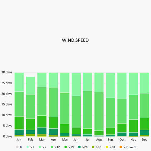 The wind rose for Nice shows how many hours per year the wind blows from the indicated direction. The diagram for Nice shows the days per month, during which the wind reaches a certain speed.
