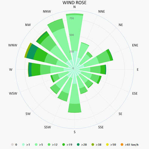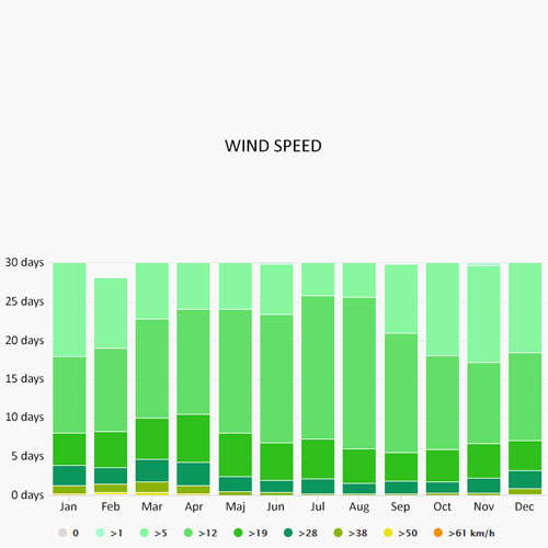 The wind rose for Hyeres shows how many hours per year the wind blows from the indicated direction. The diagram for Hyeres shows the days per month, during which the wind reaches a certain speed.