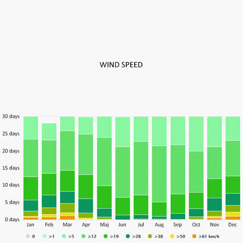 The wind rose for Biograd na Moru shows how many hours per year the wind blows from the indicated direction. The diagram for Biograd na Moru shows the days per month, during which the wind reaches a certain speed.