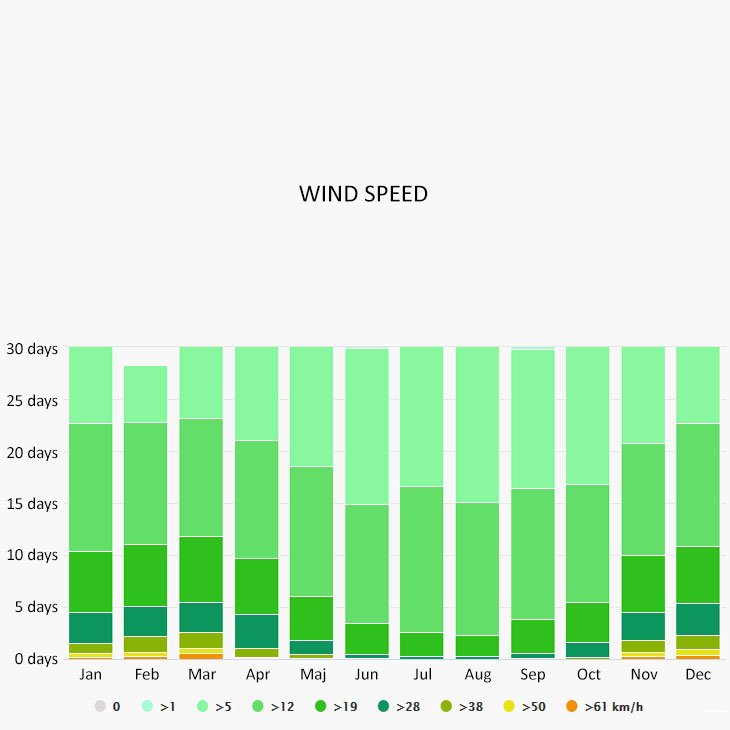 The wind rose for Supetar shows how many hours per year the wind blows from the indicated direction. The diagram for Supetar shows the days per month, during which the wind reaches a certain speed.