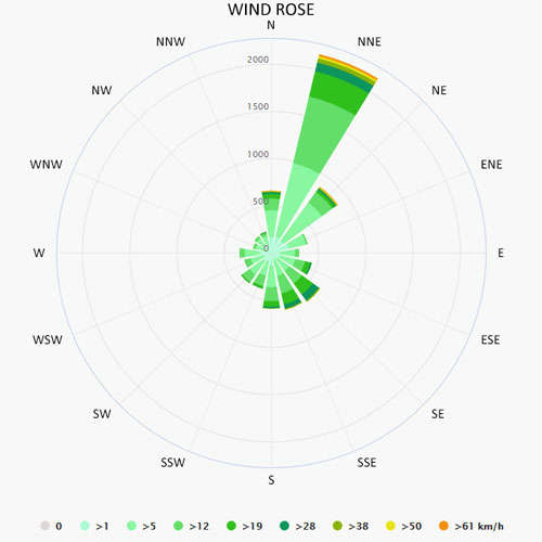 The wind rose for Brbinj shows how many hours per year the wind blows from the indicated direction. The diagram for Brbinj shows the days per month, during which the wind reaches a certain speed.