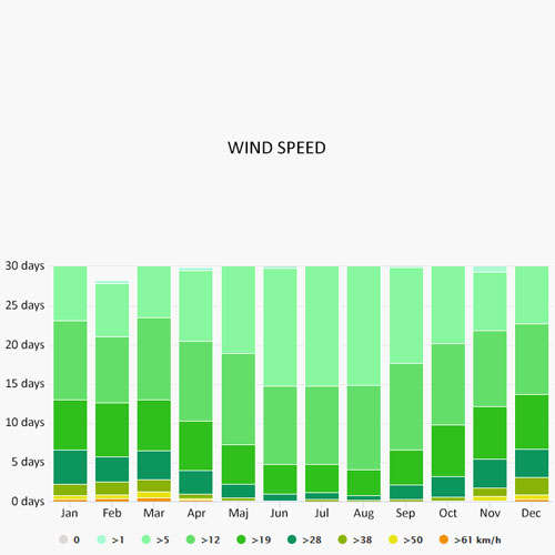 The wind rose for Pula shows how many hours per year the wind blows from the indicated direction. The diagram for Pula shows the days per month, during which the wind reaches a certain speed.