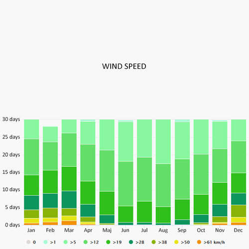 The wind rose for Mali Losinj shows how many hours per year the wind blows from the indicated direction. The diagram for Mali Losinj shows the days per month, during which the wind reaches a certain speed.