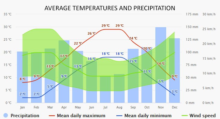 The climate diagrams are based on 30 years of hourly weather model simulations. They give good indications of typical climate patterns and expected conditions (temperature, precipitation, sunshine, and wind). The “mean daily maximum” (solid red line) shows the maximum temperature of an average day for every month for Pag. Likewise, the “mean daily minimum” (solid blue line) shows the average minimum temperature.