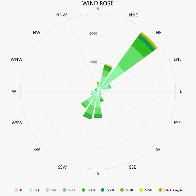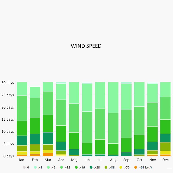 The wind rose for Pag shows how many hours per year the wind blows from the indicated direction. The diagram for Pag shows the days per month, during which the wind reaches a certain speed.