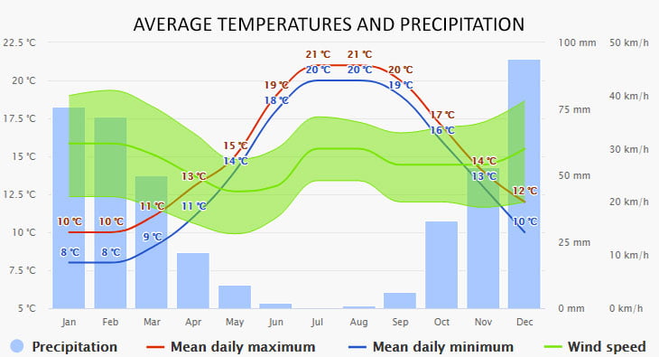 The climate diagrams are based on 30 years of hourly weather model simulations. They give good indications of typical climate patterns and expected conditions (temperature, precipitation, sunshine, and wind). The “mean daily maximum” (solid red line) shows the maximum temperature of an average day for every month for Keramoti. Likewise, the “mean daily minimum” (solid blue line) shows the average minimum temperature.