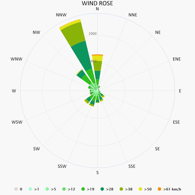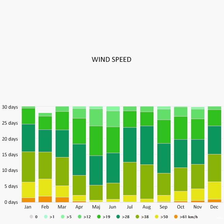 The wind rose for Keramoti shows how many hours per year the wind blows from the indicated direction. The diagram for Keramoti shows the days per month, during which the wind reaches a certain speed.