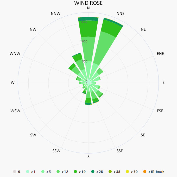 The wind rose for Thassos shows how many hours per year the wind blows from the indicated direction. The diagram for Thassos shows the days per month, during which the wind reaches a certain speed.