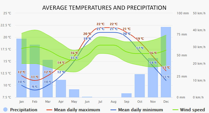 The climate diagrams are based on 30 years of hourly weather model simulations. They give good indications of typical climate patterns and expected conditions (temperature, precipitation, sunshine, and wind). The “mean daily maximum” (solid red line) shows the maximum temperature of an average day for every month for Amorgos. Likewise, the “mean daily minimum” (solid blue line) shows the average minimum temperature.
