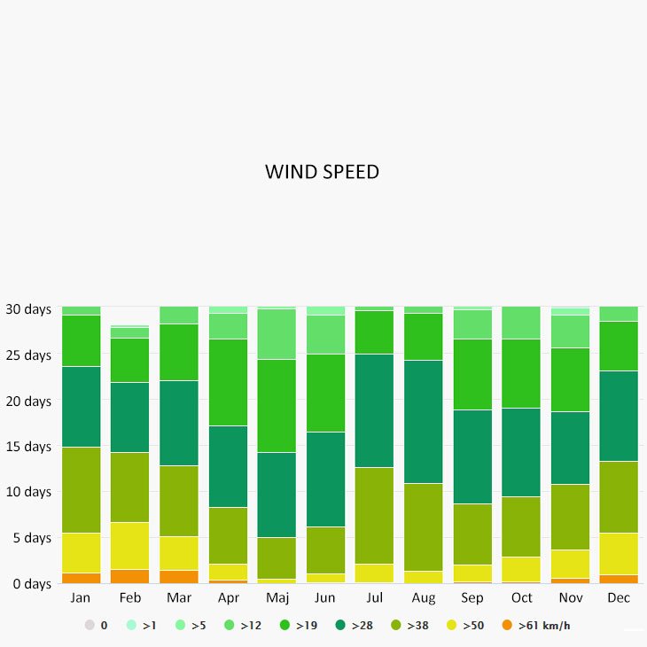 The wind rose for Amorgos shows how many hours per year the wind blows from the indicated direction. The diagram for Amorgos shows the days per month, during which the wind reaches a certain speed.