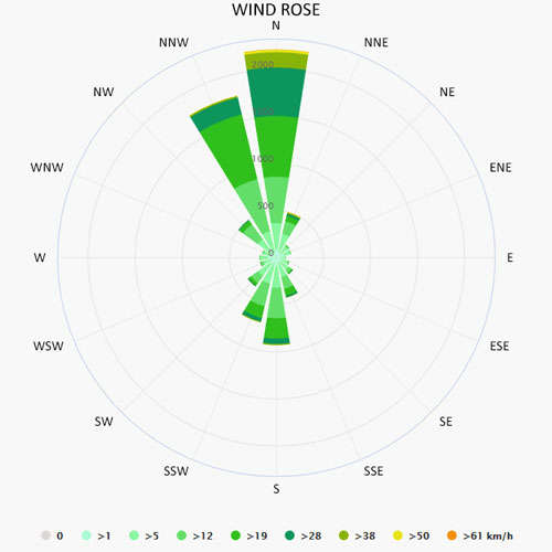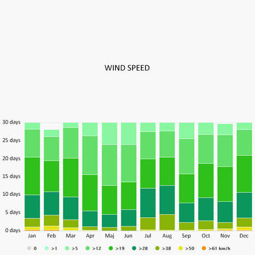 The wind rose for Lavrion shows how many hours per year the wind blows from the indicated direction. The diagram for Lavrion shows the days per month, during which the wind reaches a certain speed.