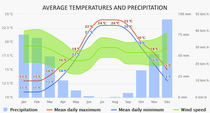 The climate diagrams are based on 30 years of hourly weather model simulations. They give good indications of typical climate patterns and expected conditions (temperature, precipitation, sunshine, and wind). The “mean daily maximum” (solid red line) shows the maximum temperature of an average day for every month for Paros. Likewise, the “mean daily minimum” (solid blue line) shows the average minimum temperature.