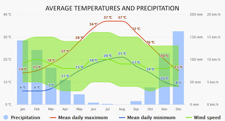 The climate diagrams are based on 30 years of hourly weather model simulations. They give good indications of typical climate patterns and expected conditions (temperature, precipitation, sunshine, and wind). The “mean daily maximum” (solid red line) shows the maximum temperature of an average day for every month for Kolymbia. Likewise, the “mean daily minimum” (solid blue line) shows the average minimum temperature.