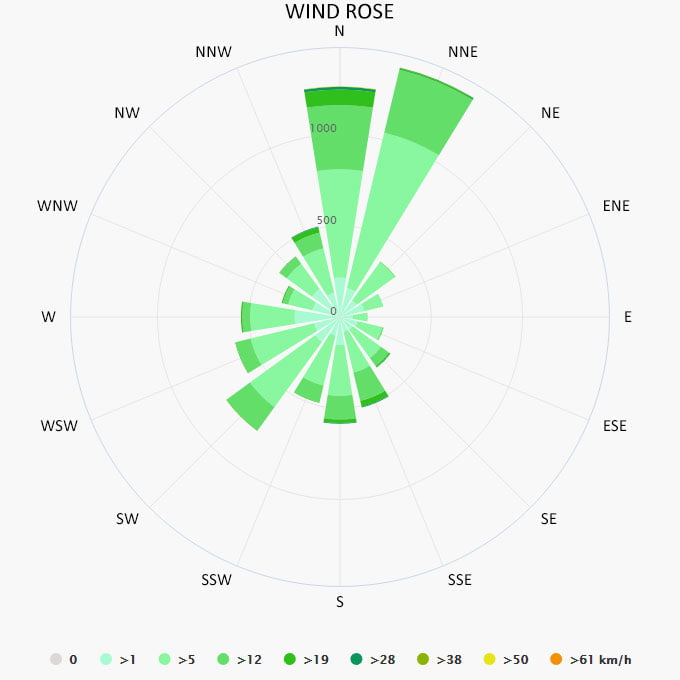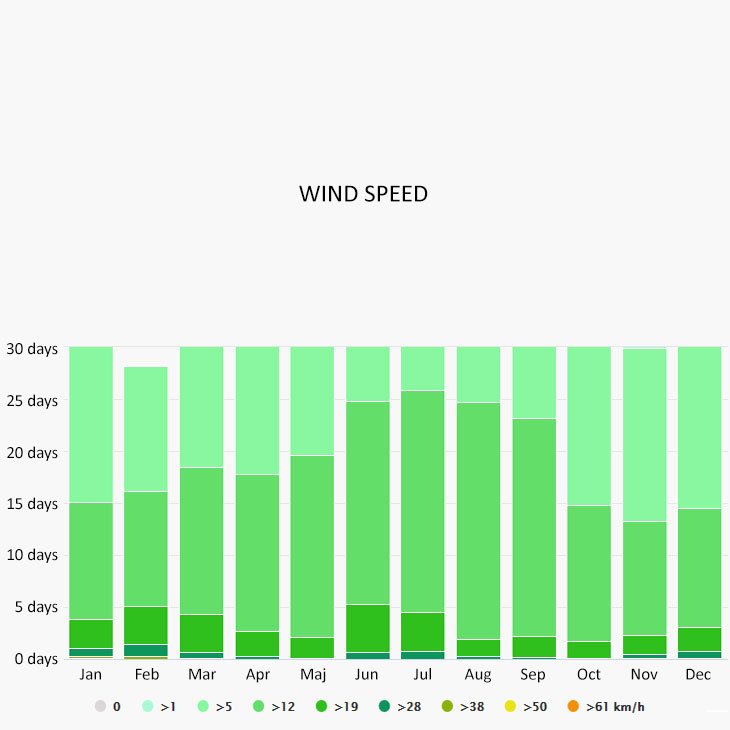 The wind rose for Kolymbia shows how many hours per year the wind blows from the indicated direction. The diagram for Kolymbia shows the days per month, during which the wind reaches a certain speed.