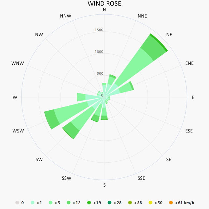 The wind rose for Argostoli shows how many hours per year the wind blows from the indicated direction. The diagram for Argostoli shows the days per month, during which the wind reaches a certain speed.