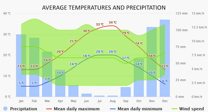 The climate diagrams are based on 30 years of hourly weather model simulations. They give good indications of typical climate patterns and expected conditions (temperature, precipitation, sunshine, and wind). The “mean daily maximum” (solid red line) shows the maximum temperature of an average day for every month for Vasiliki. Likewise, the “mean daily minimum” (solid blue line) shows the average minimum temperature.
