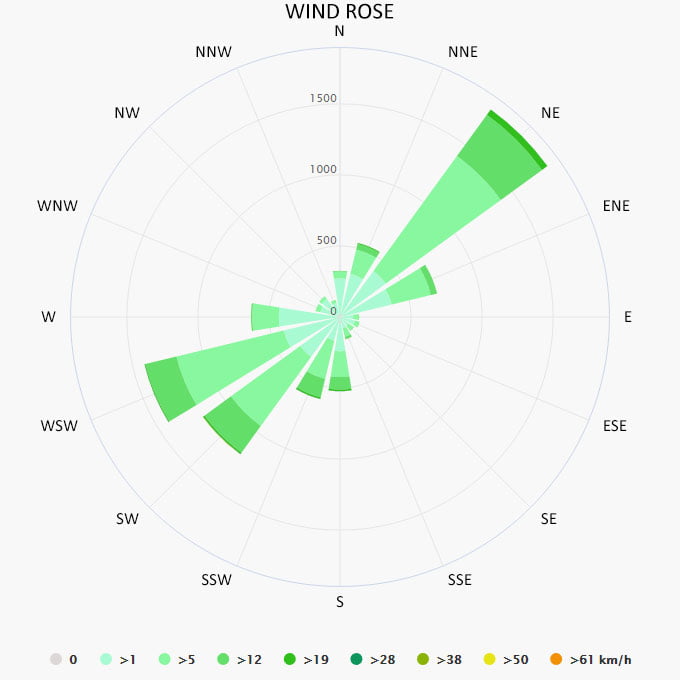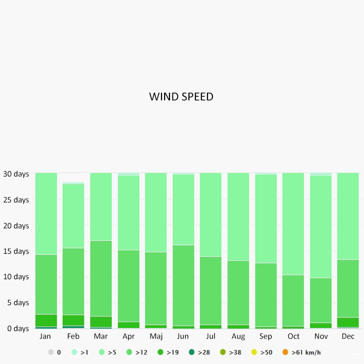 The wind rose for Vasiliki shows how many hours per year the wind blows from the indicated direction. The diagram for Vasiliki shows the days per month, during which the wind reaches a certain speed.