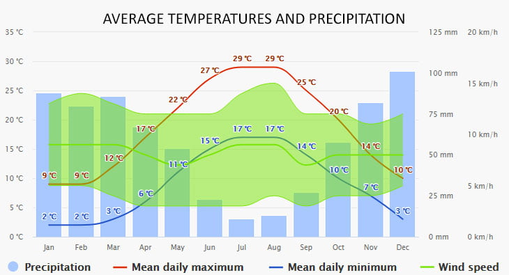 The climate diagrams are based on 30 years of hourly weather model simulations. They give good indications of typical climate patterns and expected conditions (temperature, precipitation, sunshine, and wind). The “mean daily maximum” (solid red line) shows the maximum temperature of an average day for every month for Peloponnese. Likewise, the “mean daily minimum” (solid blue line) shows the average minimum temperature.