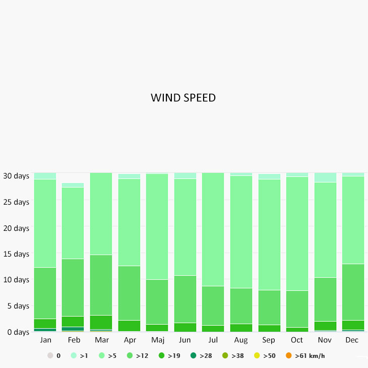 The wind rose for Peloponnese shows how many hours per year the wind blows from the indicated direction. The diagram for Peloponnese shows the days per month, during which the wind reaches a certain speed.
