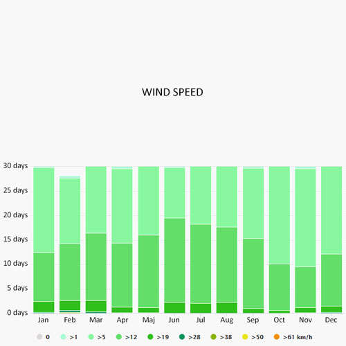 The wind rose for Zakynthos shows how many hours per year the wind blows from the indicated direction. The diagram for Zakynthos shows the days per month, during which the wind reaches a certain speed.