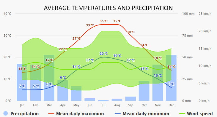 The climate diagrams are based on 30 years of hourly weather model simulations. They give good indications of typical climate patterns and expected conditions (temperature, precipitation, sunshine, and wind). The “mean daily maximum” (solid red line) shows the maximum temperature of an average day for every month for Aegina. Likewise, the “mean daily minimum” (solid blue line) shows the average minimum temperature.