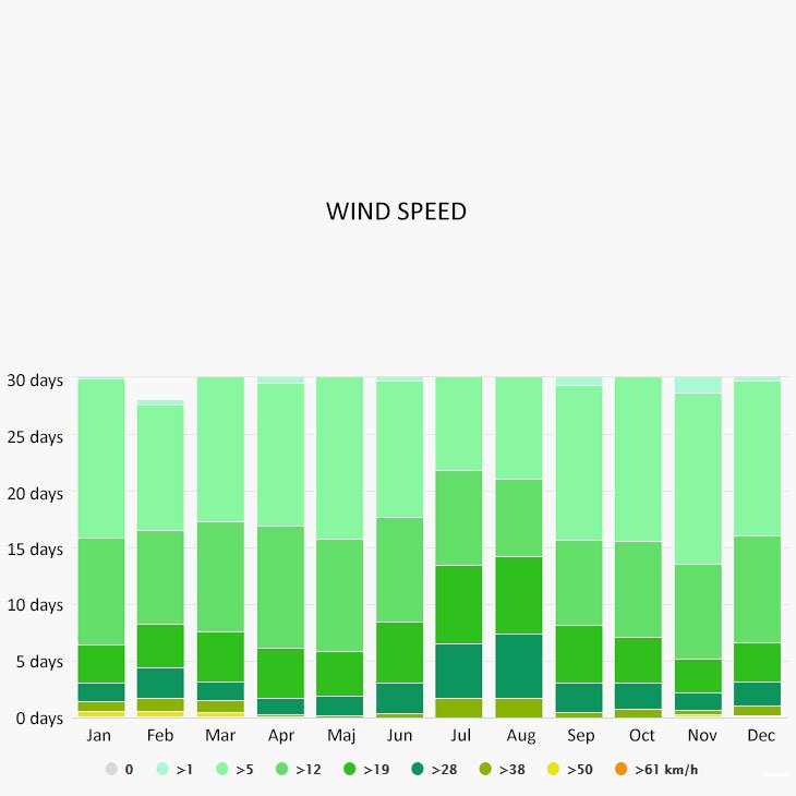 The wind rose for Aegina shows how many hours per year the wind blows from the indicated direction. The diagram for Aegina shows the days per month, during which the wind reaches a certain speed.