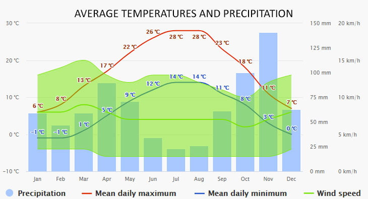 The climate diagrams are based on 30 years of hourly weather model simulations. They give good indications of typical climate patterns and expected conditions (temperature, precipitation, sunshine, and wind). The “mean daily maximum” (solid red line) shows the maximum temperature of an average day for every month for Lake Como. Likewise, the “mean daily minimum” (solid blue line) shows the average minimum temperature.