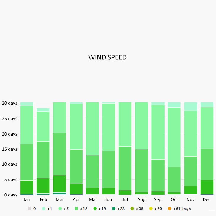 The wind rose for Lake Como shows how many hours per year the wind blows from the indicated direction. The diagram for Lake Como shows the days per month, during which the wind reaches a certain speed.