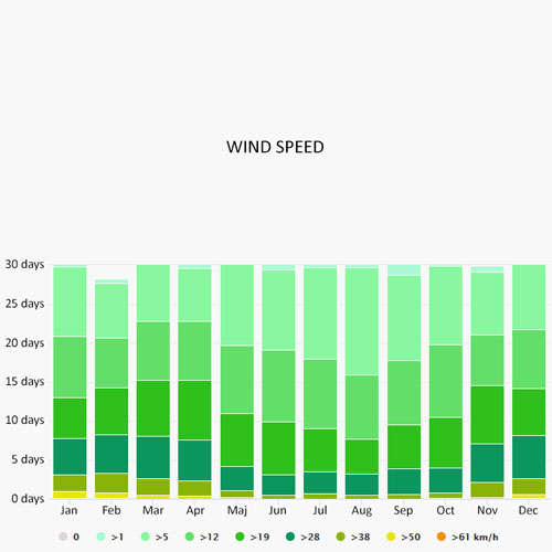 The wind rose for Cagliari shows how many hours per year the wind blows from the indicated direction. The diagram for Cagliari shows the days per month, during which the wind reaches a certain speed.