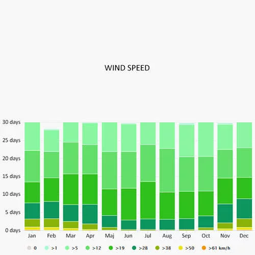 The wind rose for Sardinia shows how many hours per year the wind blows from the indicated direction. The diagram for Sardinia shows the days per month, during which the wind reaches a certain speed.