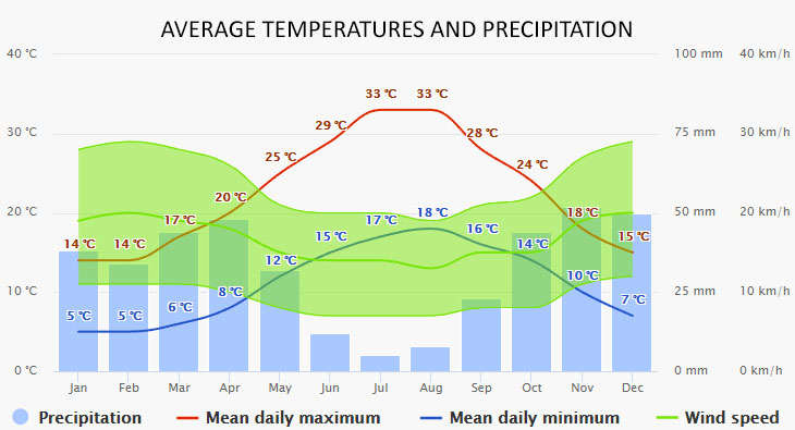 The climate diagrams are based on 30 years of hourly weather model simulations. They give good indications of typical climate patterns and expected conditions (temperature, precipitation, sunshine, and wind). The “mean daily maximum” (solid red line) shows the maximum temperature of an average day for every month for Cannigione. Likewise, the “mean daily minimum” (solid blue line) shows the average minimum temperature.