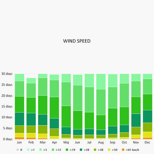 The wind rose for Cannigione shows how many hours per year the wind blows from the indicated direction. The diagram for Cannigione shows the days per month, during which the wind reaches a certain speed.