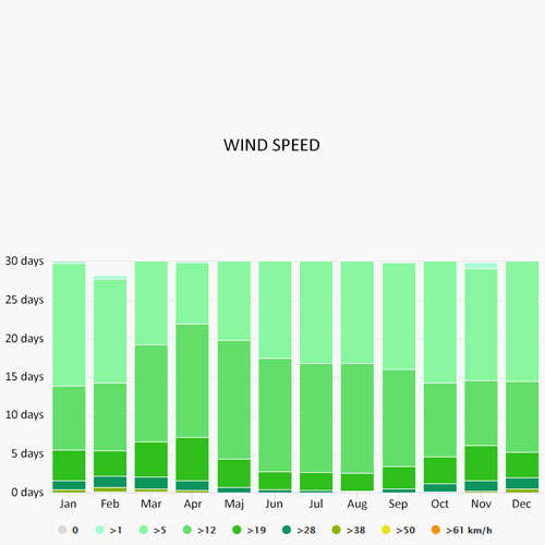 The wind rose for Venice shows how many hours per year the wind blows from the indicated direction. The diagram for Venice shows the days per month, during which the wind reaches a certain speed.