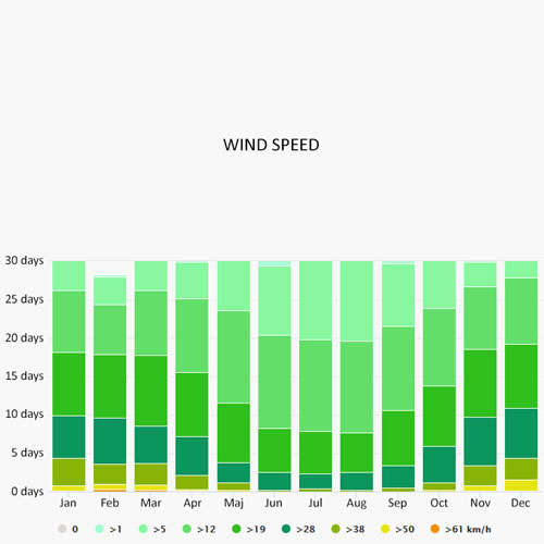 The wind rose for Palma De Mallorca shows how many hours per year the wind blows from the indicated direction. The diagram for Palma De Mallorca shows the days per month, during which the wind reaches a certain speed.