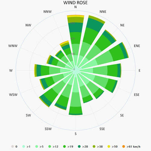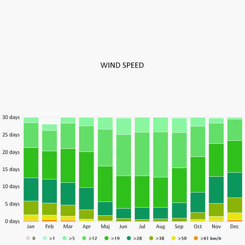 The wind rose for Menorca shows how many hours per year the wind blows from the indicated direction. The diagram for Menorca shows the days per month, during which the wind reaches a certain speed.