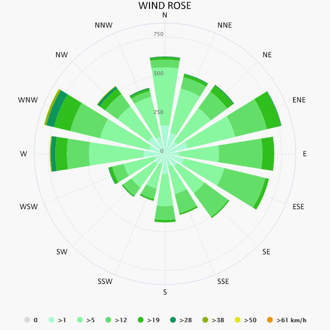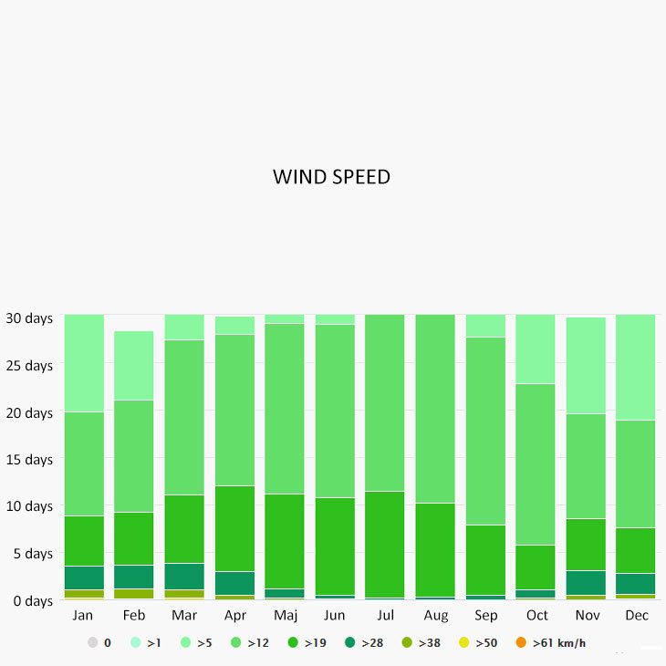The wind rose for Torrevieja shows how many hours per year the wind blows from the indicated direction. The diagram for Torrevieja shows the days per month, during which the wind reaches a certain speed.