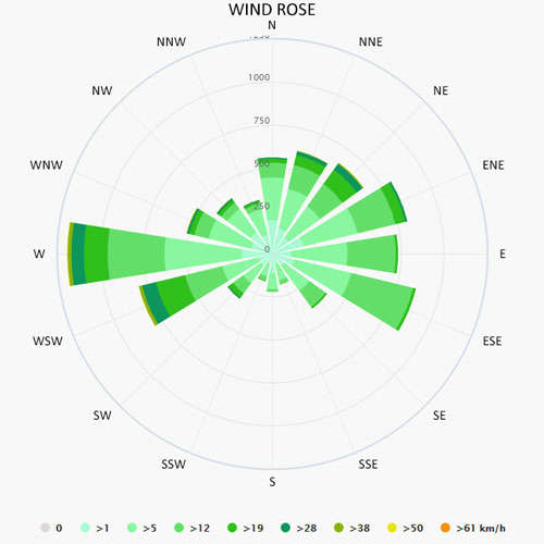 The wind rose for Valencia shows how many hours per year the wind blows from the indicated direction. The diagram for Valencia shows the days per month, during which the wind reaches a certain speed.