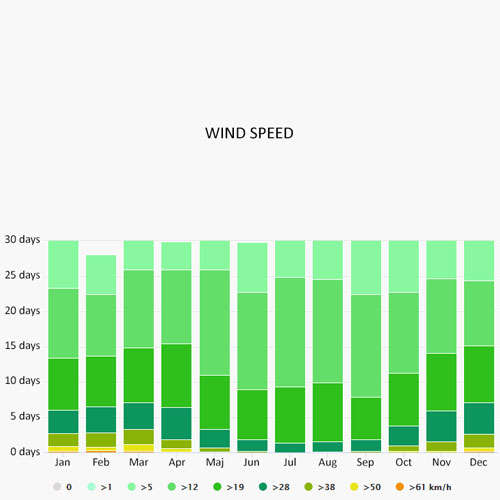 The wind rose for Costa Brava shows how many hours per year the wind blows from the indicated direction. The diagram for Costa Brava shows the days per month, during which the wind reaches a certain speed.