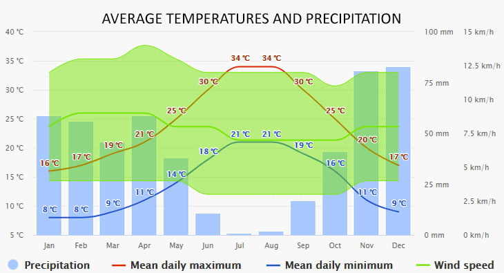 The climate diagrams are based on 30 years of hourly weather model simulations. They give good indications of typical climate patterns and expected conditions (temperature, precipitation, sunshine, and wind). The “mean daily maximum” (solid red line) shows the maximum temperature of an average day for every month for Malaga . Likewise, the “mean daily minimum” (solid blue line) shows the average minimum temperature.